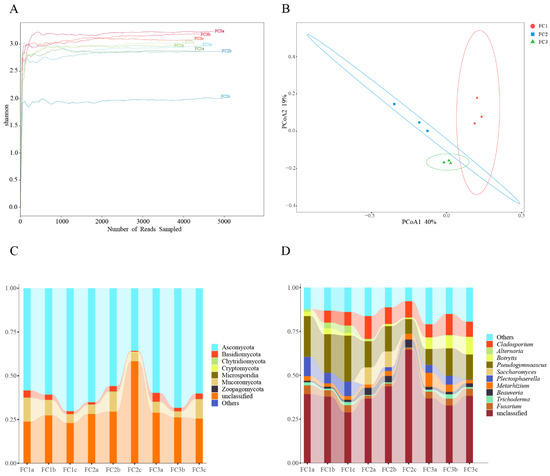 Diversity and composition of fungal communities in FC samples. (A) Shannon–Winner curve of fungal community in FC samples. (B) Fungal communities were based on Bray–Curtis PCoA analysis. (C) Composition of fungal community at phylum level (TOP10). (D) Composition of fungal community at genus level (TOP10).