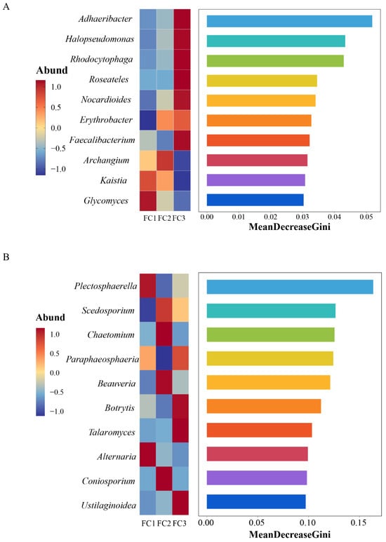 Random forest analysis was used to screen microorganisms of differential bacterial genera (A) and differential fungal genera (B).