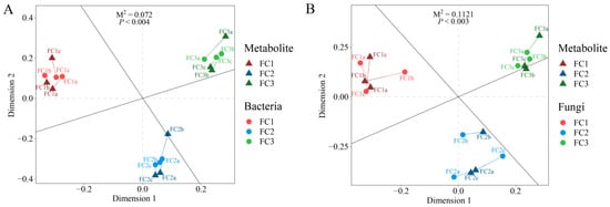 Procrustes analysis was used to evaluate the relationship between bacterial communities and metabolites (A) and the relationship between fungal communities and metabolites (B).