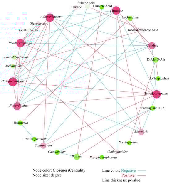 We further conducted a co-occurrence network analysis to explore the relationship between these differential microbial genera and differential metabolites. After deleting the isolated nodes, 11 metabolites, 9 fungal genera, and 8 bacterial genera remained and participate in mapping the correlation network (Figure 7). The correlation network shows that there are more positive correlations (25) than negative correlations (23). Halopseudomonas has the most significant relationships with other nodes. Uridine, a differential metabolite, was only significantly negatively correlated with Halopseudomonas and Nocardioides. There was a significant positive correlation between linoleic acid and Botrytis. Prostaglandin J2 has a significant negative correlation with Chaetomium and a significant positive correlation with Botrytis. Citrulline was negatively correlated with Adhaeribacter, Rhodocytophaga, Halopseudomonas, and Nocardioides; negatively correlated with Ustilaginoidea; and positively correlated with Alternaria. Similarly, cytidine showed a significant negative correlation with the above four bacterial genera. However, triiodothyronine showed a significant positive correlation with the above four bacterial genera and fungal genera Talaromyces, and a significant negative correlation with Alternaria.