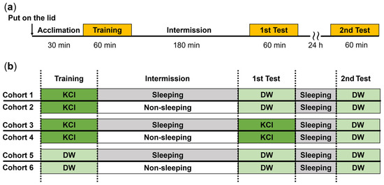 Escape behavior suppression learning (EBSL) experiments were conducted using the procedures described in previously published reports [17,22,24]. Snails were collected from their home aquaria and individually placed onto a 35 mm Petri dish lid filled with DW at a depth of 3 mm for 30 min to acclimate to DW (Figure 1). Then, the Petri dish lids were placed on a tray with either a 100 mM KCl solution (punishment) or just DW (control). First, there was a 60 min training period. The number of escapes (i.e., snails climbing over the Petri dish lid) was recorded (Training indicated in figures). The timing of the escape was defined as the moment when L. stagnalis leaned over the lid and put its head onto the tray containing either KCl or DW. Following the escape, the snail was moved back to the center of the Petri dish lid. In addition to recording the number of escapes, the latency of the first escape was also recorded. For individuals that did not escape during the 60 min training session, the first escape was considered to have a latency of 60 min. Next, we imposed either the sleep-like quiescent or the active (i.e., non-sleeping) period for 3 h. Previously, Nakai et al. (2020) used anisomycin (a protein synthesis inhibitor) and actinomycin (a transcription inhibitor) to show that long-term memory formation following a training procedure like that used here occurred about 2 h after the training procedure [25]. Therefore, the imposed 3 h interval following training was sufficient for long-term memory formation to occur. In the 3 h interval, snails were individually placed into a 50 mL tube containing 5 mL DW. In the sleep-like quiescent group, the DW was changed every 10 min. In the active group, we applied 10 mM sucrose for 15 s every 10 min. Between sucrose applications, the sucrose solution was replaced with DW. Exchanges of these solutions were performed using a 5 mL pipette. Finally, there was an initial memory test (1st Test in figures) given to all the snails for 60 min. The same procedure was used as in the training period.