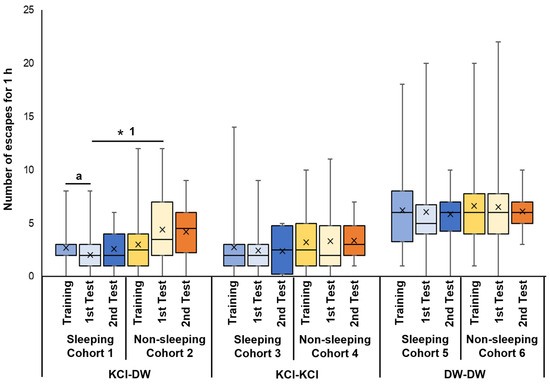 Number of escapes in training and memory-test periods of EBSL. Blue boxes indicate the data from the training period before the experience of sleep-like quiescent state. Light blue boxes indicate the data from the 1st memory-test period after the experience of sleep-like quiescent state. Dark blue boxes indicate the data from the 2nd memory-test period 24 h later. Yellow boxes indicate the data from the training period before the experience of non-sleeping active state. Light yellow boxes indicate the data from the 1st memory-test period after the experience of non-sleeping active state. Orange boxes indicate the data from the 2nd memory-test period 24 h later. The left 6 bars show the data obtained from cohorts subjected to KCl in the training period and DW in the 1st and 2nd memory periods. The middle 6 bars show the data obtained from the cohorts subjected to KCl in the training period and KCl in the 1st and 2nd memory-test periods. The right 6 bars show the data obtained from the cohorts subjected to DW in the training period and DW in the 1st and 2nd memory-test periods. ‘a’ indicates p = 0.032, N = 40; ‘* 1’ indicates p = 0.019, N = 40.