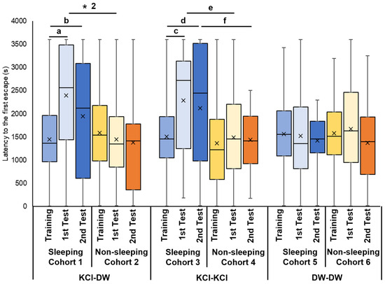 First escape latency in EBSL training and memory-test periods. Blue boxes indicate the data from the training period before the experience of sleep-like quiescent state. Light blue boxes indicate the data from the 3 h memory-test (i.e., 1st memory-test) period after the experience of sleep-like quiescent state. Dark blue boxes indicate the data from the 24 h memory test (i.e., the 2nd memory test). Yellow boxes indicate the data from the training period before the experience of a non-sleeping active state. Light yellow boxes indicate the data from the 3 h memory-test (i.e., 1st memory-test) period after the experience of non-sleeping active state. Orange boxes indicate the data from the 24 h memory test (i.e., the 2nd memory test). The left 6 bars show the data obtained from cohorts subjected to KCl in the training period and DW in 1st and 2nd memory-test periods. The middle 6 bars show the data obtained from the cohorts subjected to KCl in the training period and KCl in the 3 h and 24 h memory-test periods (i.e., 1st and 2nd memory tests). The right 6 bars show the data obtained from the cohorts subjected to DW in the training period and DW in the 3 h and 24 h memory-test periods (i.e., 1st and 2nd memory-test periods). ‘a’ indicates p < 0.001, N = 40; ‘b’ indicates p = 0.035, N = 40 for the 1st bar and 20 for the 3rd bar; ‘c’ indicates p = 0.006, N = 40; ‘d’ indicates p = 0.007, N = 40 for the 7th bar and 20 for the 9th bar; ‘e’ indicates p = 0.046, N = 40; ‘f’ indicates p = 0.009, N = 20; ‘* 2’ indicates p = 0.041, N = 40.