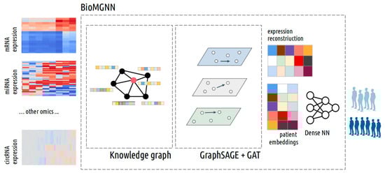 Taking into account the fact that biological data can be easily represented as a network where nodes represent the different biological components (genes, proteins, etc.) and edges represent the relationship between them, enabling machine learning to incorporate information about the structure of multi-omics knowledge graphs into the model opens new avenues to make predictions or discover new patterns using this relational knowledge for application in new use cases [23,24,25]. For example, a graph classification task, which predicts an attribute of each graph in a collection of graphs, can be used for patient classification. In the same way, node classification tasks predict an attribute of each node in a graph, which enable them to be used for biomarker discovery. Another interesting use case is the use of the node feature prediction task for data imputation. Finally, link prediction to predict an attribute of edges in a graph can be used to predict whether an edge should exist in the graph with application on associations of bioentities such as miRNA-target.
