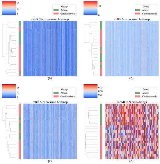 Visual exploration of the expression data using a clustered heatmap: (a) Expression levels of the original circRNA data, (b) expression levels of the original miRNA data, (c) expression levels of the original mRNA data, and (d) bioMGNN-calculated patient embeddings. The green (Cardioembolic) and blue (Atherosclerotic) left bar indicates patient etiology. BioMGNN shows better performance in clustering similar patients than the original data sources.