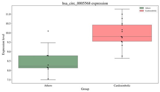 Expression levels of hsa_circ_0005568 in Atherosclerotic vs. Cardioembolic groups. These differential expression levels were further confirmed by RT-qPCR in a validation cohort.