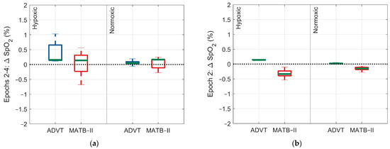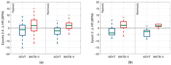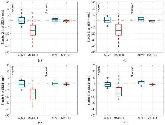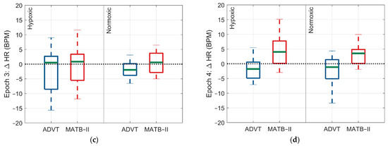 Within- and between-group tests were performed using two-factor analysis of variance (ANOVA) models. These models evaluated the following: (1) differences in HR, rMSSD, SDNN, and SpO2 across epochs 1, 2, 3, and 4 separately for the ADVT and MATB-II, stratified by the Factor A conditions (hypoxic and normoxic); (2) differences in HR, rMSSD, SDNN, and SpO2 between the ADVT and EAF-MATB-II tests for epochs 1, 2, 3, and 4 within each Factor A condition (hypoxic and normoxic); and (3) differences in HR, rMSSD, SDNN, and SpO2 between Factor A conditions (hypoxic vs. normoxic) separately for the ADVT and EAF-MATB-II. Additionally, box-and-whisker plots were created to graphically represent the within- and between-group differences. All groups were tested for normality using Kolmogorov–Smirnov testing and satisfied the normal distribution assumption of linear regression. Statistical analysis was performed using MATLAB R2022a. Statistical significance was set a priori at <0.05.