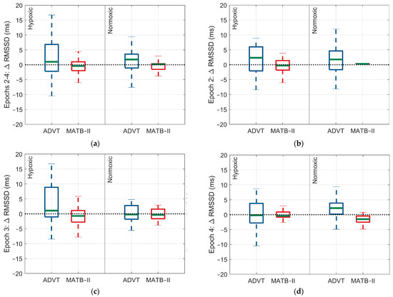 Differences in the rMSSD response within and between low and high cognitive load assessments by epoch and within and between Factor A conditions. (a) Change in rMSSD response across epochs 2 through 4, (b) change in rMSSD response during epoch 2, (c) change in rMSSD response during epoch 3, (d) change in rMSSD response during epoch 4. The blue and red indicate each test administered, ADVT and MATB-II, respectively.