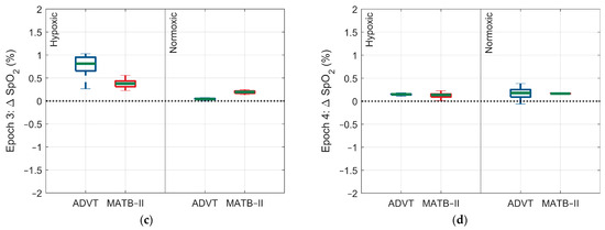Differences in the SpO2 response within and between low and high cognitive load assessments by epoch and within and between Factor A conditions. (a) Change in SpO2 response across epochs 2 through 4, (b) change in SpO2 response during epoch 2, (c) change in SpO2 response during epoch 3, (d) change in SpO2 response during epoch 4. The blue and red indicate each test administered, ADVT and MATB-II, respectively.