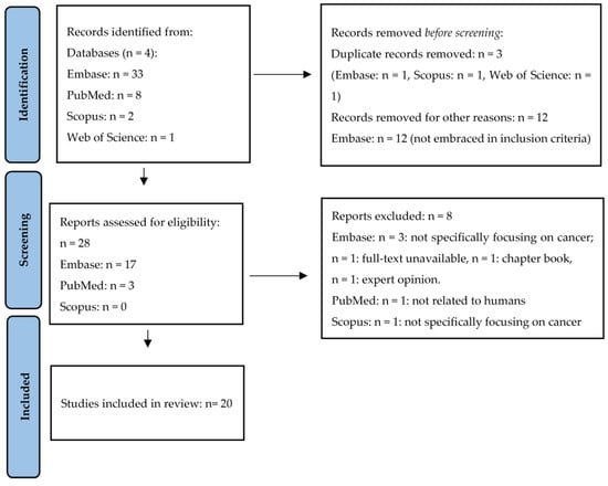 During the first phase of the present scoping review, a total of 44 studies were identified. Of these, 3 studies were removed before screening as they were duplicates and other 12 articles were excluded, as they were not pertinent to our purpose. A total of 28 eligible articles were found. However, 8 of these studies were excluded, since they did not meet the inclusion criteria. Finally, the remaining 20 manuscripts were included in the present scoping review. A summary of the article screening process is presented in the PRISMA flow diagram (Figure 1).