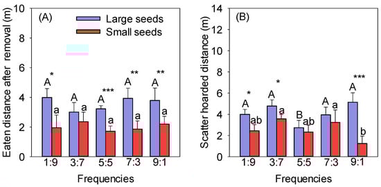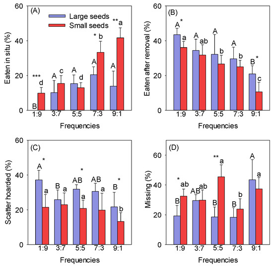 Effect of frequency on the eaten in situ (A), eaten after removal (B), scatter-hoarded (C), and missing (D) fates of different-sized seeds. Different uppercase letters indicate significant differences between large seeds at different frequencies, and different lowercase letters indicate significant differences between small seeds at different frequencies. * p < 0.05, ** p < 0.01, and *** p < 0.001 indicate significant differences between seeds of different sizes at the same frequency.