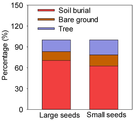There were three hoarding methods for seeds of different sizes, i.e., soil burial, exposure on the bare ground, and hoarding in trees (including at the base of trees and abandoned nests) (Figure 3). The rates of soil burial, exposure on the bare ground, and hoarding in trees of large seeds were 70.52%, 12.77%, and 16.71%, respectively, while those in trees of small seeds were 62.55%, 16.00%, and 21.45%, respectively. The soil burial rate of large and small seeds was more than 60% (Figure 3).