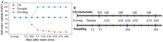 Two maize (Zea mays L.) hybrids of Yindieyu 9 (tolerant to drought and flooding) and Heyu 397 (sensitive to drought and flooding) based on a previous study [3] were designed as the main plot and planted in plastic pots (32.5 cm diameter, and 29.0 cm height) on the 28th September 2020. The pots were arranged in a split-split plot design with three replications and placed at 60 cm row spacing and 32.5 cm center distance of the pot. Ten seeds were planted per pot, and five seedlings per pot were thinned at the two-leaf stage. During the early growth period of the maize seedlings, the soil water content was maintained at the normal field capacity (FC) of 70–75%. The seedlings at V3 were imposed with progressive drought (40–45% FC) and flooding (2.0–3.0 cm standing layer) stresses for 8 d; additionally, normal FC was set as a control (CK), and those were designed as the split-plot. The soil moisture content for CK and drought stress was controlled based on daily measurements of pot weight, in which each pot weight was controlled between 9.59 and 9.72 kg (70–75% FC) for CK and 8.88 and 9.00 kg for drought stress (40–45% FC); the details are shown in Figure 1A. For flooding stress, the water level was maintained using an additional big pot without holes placed in each pot. Different concentrations of GB with 0, 0.5, 1.0, 5.0, and 10.0 mM, designated hereafter as GB0, GB1, GB2, GB3, and GB4, respectively, were selected based on previous studies [21,25,33,34], designed as a split-split plot, and sprayed using a 500 mL watering pot to each pot with 25.0 mL after 1, 3, 5, and 7 days of stress (Figure 1B). After 4 d and 8 d of treatments, the indicators were measured, and all fully developed leaves per pot were sampled and stored at −80 °C until further analysis for ROS, antioxidant enzyme activities, and proline content (Figure 1B).