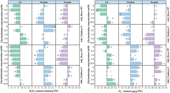 Further research is still needed to fully understand the numerous defense regulations and stress tolerance of plants to drought and flooding, as well as the possible involvement of exogenous GB in the defense process. Therefore, our main objectives in this study were to (1) detect the different stress defenses and ROS scavenging mechanisms of maize leaves when separately subjected to drought and flooding; (2) determine the optimum concentration of GB for foliar spray on maize leaves at V3; and (3) determine the different effects of GB on water-tolerant or -sensitive varieties of maize under drought and flooding. The results of this study will be crucial for promoting sustainable cultivation and management of maize.