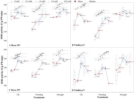 The effect of glycinebetaine on superoxide dismutase (SOD) activity after 4 d (A,B) and 8 d (C,D) of water stress. Data with standard error bars (n = 3, biological replicates) are presented; CK represents maize planted in normal field capacity; the 0, 0.5, 1.0, 5.0, and 10.0 mM are the different concentrations of glycinebetaine; *, **, *** mean significant p value ≤ 0.05, ≤0.01, ≤0.001, respectively, if no symbol is presented between treatments, meaning p value > 0.05.