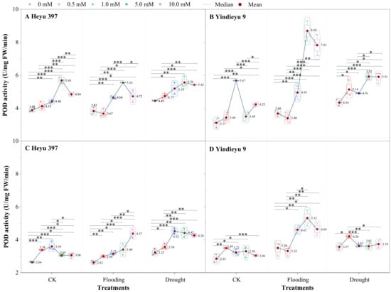The effect of glycinebetaine on guaiacol peroxidase (POD) activity after 4 d (A,B) and 8 d (C,D) of water stress. Data with standard error bars (n = 3, biological replicates) are presented; CK represents maize planted in normal field capacity; the 0, 0.5, 1.0, 5.0, and 10.0 mM are the different concentrations of glycinebetaine; *, **, *** mean significant p value ≤ 0.05, ≤0.01, ≤0.001, respectively, if no symbol is presented between treatments, meaning p value > 0.05.