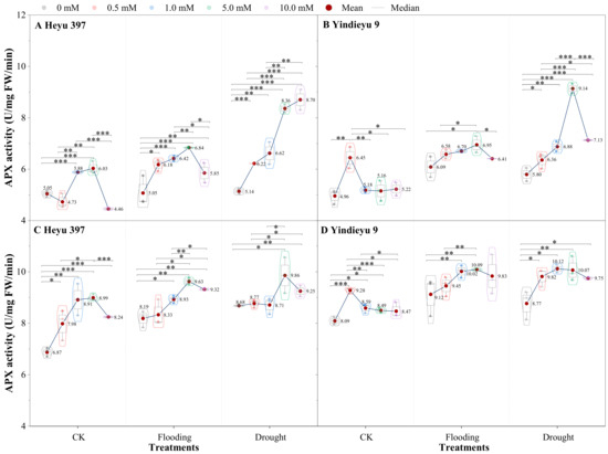 The effect of glycinebetaine on ascorbate peroxidase (APX) activity after 4 d (A,B) and 8 d (C,D) of water stress. Data with standard error bars (n = 3, biological replicates) are presented; CK is maize planted in normal field capacity; 0, 0.5, 1.0, 5.0, and 10.0 mM are the different concentrations of glycinebetaine; *, **, *** mean significant p value ≤ 0.05, ≤0.01, ≤0.001, respectively, if no symbol is presented between treatments, meaning p value > 0.05. Data.