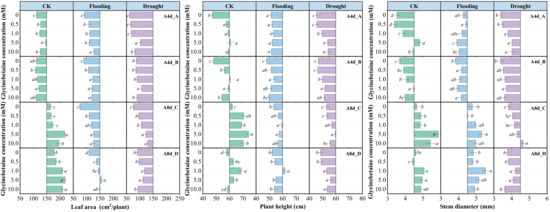 From 4 d to 8 d, LA and stem diameter in the absence of GB under flooding stress had a higher increment than under drought stress, while plant height showed the exact opposite trend. Although there was no difference in the average increment between Yindieyu 9 and Heyu 7 under drought, a higher average increment occurred under flooding in Yindieyu 9 than in Heyu 397. Meanwhile, after 8 d, maize growth was significantly suppressed when subjected to drought in the absence of GB, resulting in smaller LA, thinner stem diameter, and shorter plant height compared with CK (Figure 6, p < 0.05). By contrast, maize under flooding exhibited a thicker stem diameter, shorter plant height, and smaller LA than CK after 8 d. Although the difference in plant height between drought and flooding was not statistically significant, flooding resulted in higher plant height, stem diameter, and LA than drought in the absence of GB after 8 d (p > 0.05). Meanwhile, Yindieyu 9 maintained a significantly larger stem diameter and LA compared with Heyu 397 (p < 0.05). Foliar application of GB significantly mitigated the adverse effects of WS on maize growth, subsequently promoting crop growth (p < 0.05). With the progression of growth, GB took a more effect on LA and plant height and less of an effect on stem diameter. However, the difference in morphological indicators affected by GB in WS and variety was similar to that without GB after 8 d. The morphological indicators were first increased and then reduced with an increase in GB concentration in all treatments. However, under the effect of GB, all morphological indicators were higher than those at GB0. After 8 d, to promote growth to survive from WS, Yindieyu 9 (GB2) required less GB than Heyu 397 (GB3) to improve the stem diameter, while there was a similar and optimum dosage of GB that GB3 required between Yindieyu 9 and Heyu 397 to promote LA and plant height. Under CK, the optimum concentration for maize growth was GB3 after four times foliar application of GB, and other concentrations still maintained higher morphological indicators in comparison with GB0. The GB had the greatest effect on LA, followed by plant height, and had the lowest effect on stem diameter. Whereas, GB was more beneficial to increasing LA in Heyu 397 under flooding.