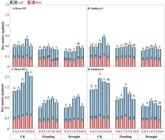 Water stress significantly slowed down the overall growth of maize seedlings, particularly in terms of leaf dry matter, compared with CK (Figure 7, p < 0.05). From 4 d to 8 d, under CK and with drought and flooding stresses in the absence of GB, the total dry matter had grown by 78.18%, 19.81%, and 28.76% in Heyu 397, respectively, and 79.46%, 49.93%, 38.55% in Yindieyu 9, respectively, in which leaf dry matter was much more severely reduced by WS, especially under flooding stress. Additionally, stem dry matter under flooding in the absence of GB was reduced by 17.65% in Heyu 397 and 4.17% in Yindieyu 9 after 8 d, although not statistically significant between flooding and CK (p > 0.05). Drought also caused a significant reduction in leaf dry matter compared with CK (p < 0.05), which was also lower than flooding. Meanwhile, higher stem biomass was also observed under flooding rather than drought, with no significant difference (p > 0.05). Similarly, Heyu 397 showed significantly lower total biomass than Yindieyu 9 under flooding (p < 0.05), and no statistically significant difference compared with Yindieyu 9 under drought. The adverse effects of WS on the biomass accumulation of maize seedlings were significantly and steadily reduced with the increasing in GB concentration (p < 0.05). The most significant increment in biomass accumulation was observed at GB3 after 4 d, while was at GB3 with Heyu 397 and GB2 with Yindieyu 9 after 8 d. Although there was no adverse effect of GB on biomass accumulation of maize seedlings in all treatments, the higher dosage of GB had an inhibitory effect on biomass accumulation. Additionally, GB had contributed more biomass accumulation towards Heyu 397 than Yindieyu 9 especially in terms of leaf dry matter, which showed an increment of 21.95% under drought and 42.71% under flooding in Heyu 397. It also led to a similar dry matter between drought and flooding in Heyu 397, which was significantly lower than Yindieyu 9.