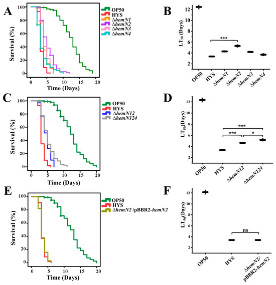 Involvement of hemN2 in the pathogenicity of HYS strain was observed in a slow-killing model of C. elegans. (A,B) Mutants of hemN1, hemN2, hemN3, and hemN4 were tested using slow-killing experiments. (C,D) Virulence of the double-knockout mutant ΔhemN12 and triple-knockout mutant ΔhemN124. (E,F) Genetically complemented strain ΔhemN2/pBBR2-hemN2 further confirmed the virulence function of hemN2. Data represent the mean ± SD, n = 100. * p < 0.05, *** p < 0.001, Student’s t-test.
