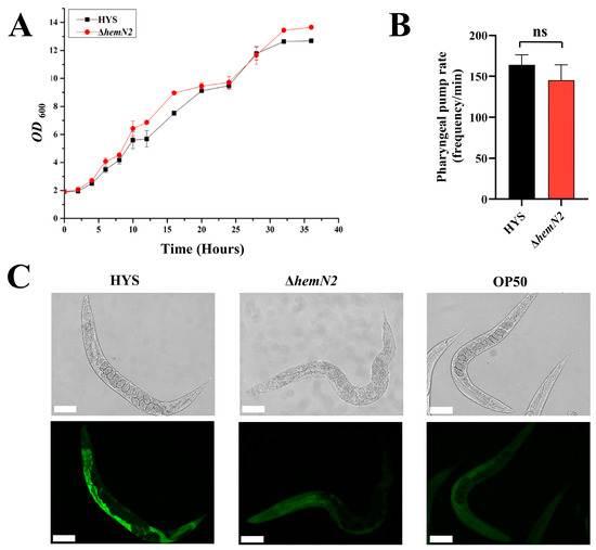 To confirm that the reduced virulence of ΔhemN2 strains towards C. elegans was not due to a growth disadvantage resulting from gene deletion, we measured the growth curve of ΔhemN2 on NGM plates. The growth curve of strain ΔhemN2 showed similar growth trends and no obvious growth defects compared to the HYS strain (Figure 2A). This indicated that the reduced virulence of the ΔhemN2 strain was indeed related to the gene itself and was not caused by insufficient bacterial growth.