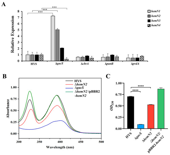 In P. donghuensis HYS, HemN was regulated by GacS and affected the production of the virulence factor 7-HT. (A) Transcription levels of hemN-related genes were detected by the Gac system (ΔgacS), Cbr/Crc system (ΔcbrA), pantothenic acid (ΔpanB), and fluorescent pyoverdine pathway (ΔpvdA) key gene deletion strains. (B) Absorption spectra of supernatants of HYS, ΔgacS, and ΔhemN2 after 24 h of incubation in MKB liquid medium. (C) Detected production of 7-HT in the culture supernatants of HYS, ΔgacS, and ΔhemN2 in MKB medium at OD330 nm. Data indicated the mean ± SD from three independent experiments. *** p < 0.001, **** p < 0.0001, Student’s t-test.