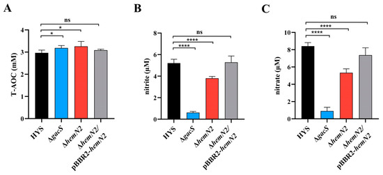 Production redox molecular levels of wild-type HYS, ΔgacS and ΔhemN2 strains. (A) Quantification of total antioxidant capacity (T-AOC). (B) Quantification of nitrite. (C) Quantification of nitrate. Data indicated the mean ± SD from three independent experiments. * p < 0.05, **** p < 0.0001, Student’s t-test.