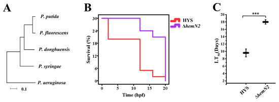 To further investigate the role of HemN2 in the pathogenicity of P. donghuensis HYS towards other hosts, we compared the amino acid sequence similarity of HemN2 in P. donghuensis HYS, P. aeruginosa, P. putida, P. fluorescens, and P. syringae and the result was 70.82% (Figure S2). We further constructed phylogenetic trees according to the amino acid sequences of HemN2 in pathogenic Pseudomonas. The results showed that P. donghuensis HYS was closest to the fish pathogen P. putida (Figure 5A). Since P. donghuensis HYS was isolated from the waters of the East Lake (China), it is speculated that it may be pathogenic to fish. Therefore, we tested the pathogenicity of wild-type HYS and its derived strains to zebrafish. The zebrafish were infected with wild-type HYS and ΔhemN2 bacterial culture by immersion, respectively. When the concentration of bacterial suspension was 6 × 106 CFU/mL, the survival rate of zebrafish infected with the ΔhemN2 strain (LT50 18.0 ± 0.599 h) was significantly higher than the wild-type HYS (LT50 9.6 ± 1.074 h) (Figure 5B,C). No deaths occurred in the negative control group. The results showed that hemN2 deletion significantly reduced the pathogenicity of P. donghuensis HYS to zebrafish.