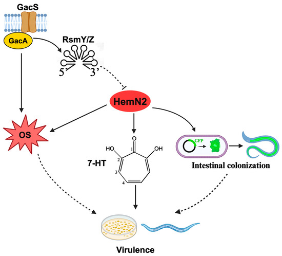 Schematic overview of the regulatory network of HemN2 involved in P. donghuensis HYS on host virulence. T-shaped lines indicate the negative control, arrows represent the positive control, solid lines highlight confirmed regulations, and dotted lines indicate unconfirmed regulations in this work. GacS and GacA represent the GacS and GacA proteins of the Gac system. RsmY/Z represent the small RNAs RsmY and RsmZ of the Gac system. 7-HT represents virulence factor 7-hydroxytropolone. OS represents the level of oxidative stress in bacteria.