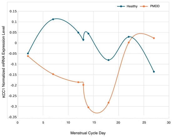 Pairwise comparisons of the estimated mean group difference by subphase indicated that KCC1 expression levels were higher in the healthy control relative to the PMDD group on days 7 (mid-follicular subphase) and 14 (periovulatory 3) (p ≤ 0.05) (Table 4 and Figure 1).