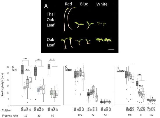 Experimental seeds were obtained in at least two individual batches. Two separate sets of ‘Thai Oakleaf’ lettuce seeds were obtained from Southern Exposure Seed Exchange (Mineral, VA, USA) and Seedwise (Folsom, CA, USA) with comparable results from each. Other comparator varieties were obtained from Johnny’s Select Seeds (Winslow, ME, USA). Reference varieties were chosen based upon their growth characteristics in survey experiments (Supplementary Materials, Figure S1) as they best approximated the mean of all seedlings under the wavebands and fluence rates tested.