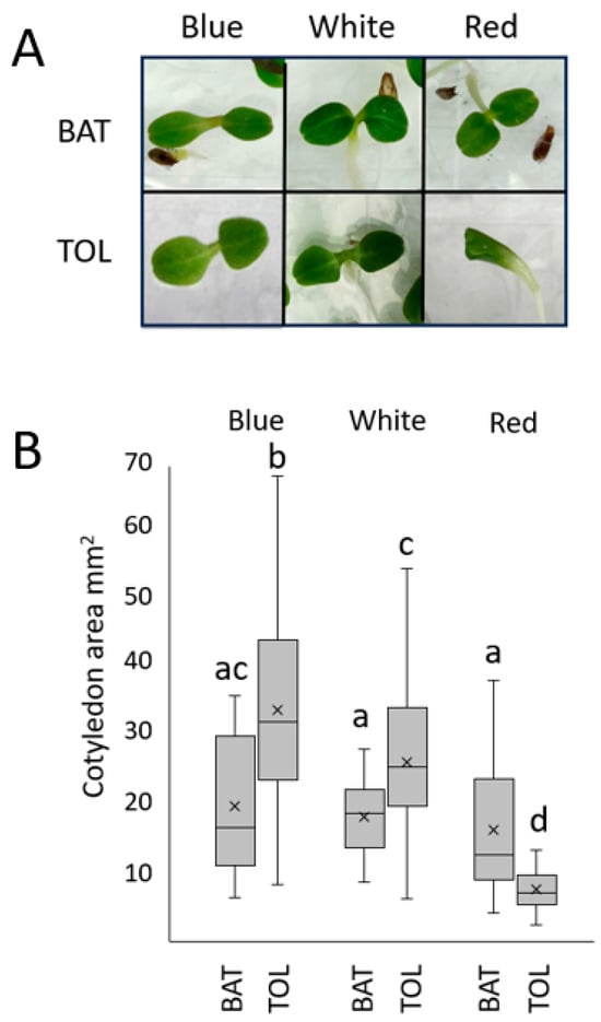 Thai Oakleaf lettuce exhibits defects in red light-mediated cotyledon expansion. Seedlings were grown under 50 µmol/m2s blue, red, or white light for 96 h. Panel (A) shows examples of individual cotyledon pairs showing expansion (not to scale), and (B) shows quantitative results from at least 22 seedlings. BAT—Anuenue Batavian Lettuce; TOL—Thai Oakleaf. Means were analyzed using ANOVA with Tukey’s HSD pairwise comparisons; letters denote non-significant differences between treatments.