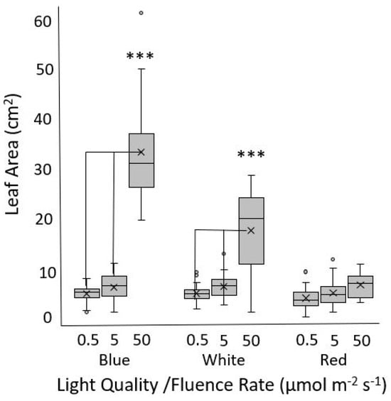 The same trends are observed in cotyledon expansion, as white and blue light treatments lead to increases in the surface area that are easily discernable in Thai Oakleaf as well as reference genotypes. However, the Thai Oakleaf variety is relatively insensitive to red light, and cotyledons remain almost perfectly closed under red light treatments with a high fluence rate (Figure 2). The expansion of true lettuce leaves is driven by both blue and red light [,]. The results in Figure 3 show that increasing the fluence rates of blue light results in larger leaves. Red light has little effect on leaf expansion, and white light is impaired, most likely because the white light source is a combination of red and blue wavebands, so the observed expansion likely represents a response to blue alone. These findings are also consistent with a phyB signaling mutation. Significant differences are also observed between the Thai Oakleaf and reference genotypes for white light; again, this is likely due to the fact that “white” light contains red wavebands.