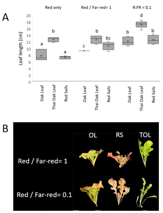 Changes in plant morphology induced by variations in red/far-red ratio. Plants were grown for 21 d under constant blue light (50 µmol/m2s) supplemented with varying ratios of red (50 or 5 µmol/m2s) to far red light (50 µmol/m2s). Panel (A) shows length of second true leaf (petiole plus midrib) in Thai Oakleaf, Oscarde Oakleaf, and Red Sails varieties in response to treatment with red alone, red, and far-red at equal amounts and red/far-red ratio of 0.1. Letters represent significant pairwise differences using ANOVA and Tukey’s HSD, p < 0.05. Panel (B) shows representative plant under two ratios of red and far-red light.
