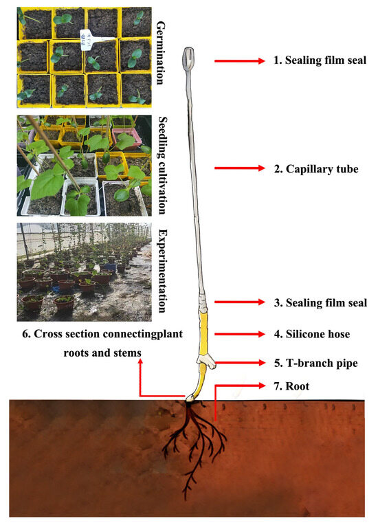The reference bubble manometer method (bubble manometer) [23] was conducted based on the original method (Figure 1): The root pressure measuring device was installed after the plant stem was cut directly from the ground between 2 and 5 cm, and after 1 h, the root pressure was collected by measuring the length of the capillary hose. The specific operation method used was as follows: A silica gel hose consistent with the thickness of the plant rhizome was used. One end was connected to the tee, and the other end of the tee was connected to the capillary hose. After pouring distilled water into one-third of the capillary hose, the capillary hose was sealed. Before sunrise, approximately between 03:00 and 04:00, on the day of the experiment, the selected plants were cut and leveled at 2–5 cm from the rhizome with fruit branches, and a silicone hose was sleeved on the stem. The silicone hose was connected to the stem, the middle of which was sealed with a sealing film, and the length of the capillary hose bubble was measured after allowing it to stand for 1 h. The formula for calculating the root pressure was Px = 100 × [(Latm/Lpd) − 1], where Px is the root pressure or sample xylem pressure (kPa), Latm is the bubble length in the capillary hose balanced with the external atmospheric pressure, and Lpd is the length of the bubbles in the capillary tube before reaching equilibrium with the external atmospheric pressure. The root activity was determined using the TTC method [24].