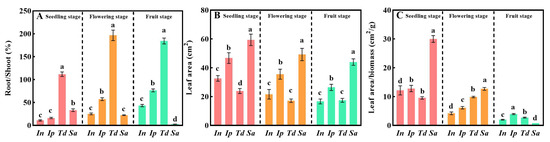 Characteristics of root–shoot ratio, leaf area, and specific leaf area of four vines at different growth stages. (A): characteristics of root–shoot ratio of four vines at different growth stages; (B): characteristics of leaf area of four vines at different growth stages; (C): characteristics of specific leaf area of four vines at different growth stages. Root/Shoot: root biomass/shoot biomass, shoot represents the aboveground biomass of the plant; In: Ipomoea nil (L.) Roth; Ip: Ipomoea purpurea (L.); Td: Thladiantha dubia Bunge; Sa: Sicyos angulatus L. Different lowercase letters indicate the significant differences among In, Ip, Td, and Sa under the same stage (p value < 0.05).