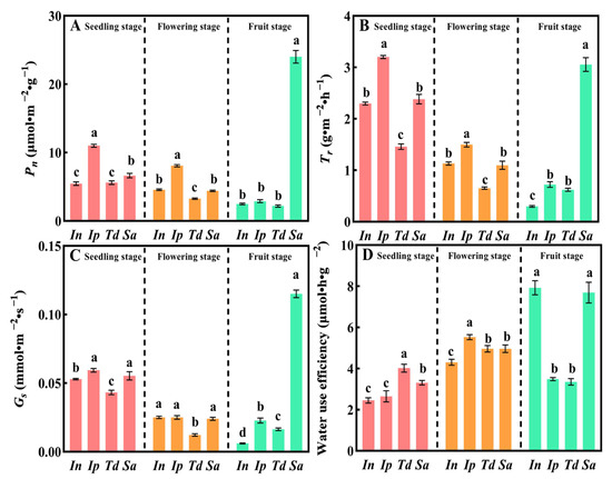 The photosynthetic characteristics of the leaves of the four plants showed that the maximum net photosynthetic rate of Sa in the fruiting period was significantly higher than that of the other three plants (Figure 3A, p < 0.05), and the maximum net photosynthetic rate of Sa at the seedling and flowering stages was weaker than that of Ip (Figure 3A), which was consistent with the total biomass results of the four plants (Figure 3A). At the fruit stage, the Tr and Gs of Sa were significantly higher than those of the other three plants (Figure 3B–D, p < 0.05). Notably, the photosynthetic characteristics of In, Ip, and Td decreased gradually with the growth and development stages (Figure 3A–C), and Sa maintained a high photosynthetic capacity in the fruiting stage (Figure 3A–C). Thus, different from the other three plants, the rapid growth stage of Sa was located between the flowering and fruiting stages, and of the four plants, Sa had the longest photosynthetic cycle. Notably, the rapid growth and high transpiration rates of plants have high water use efficiency requirements. The water use efficiency of Sa was high across the three growth stages and gradually increased with the growth stage, playing an important role in its growth and development (Figure 3D).