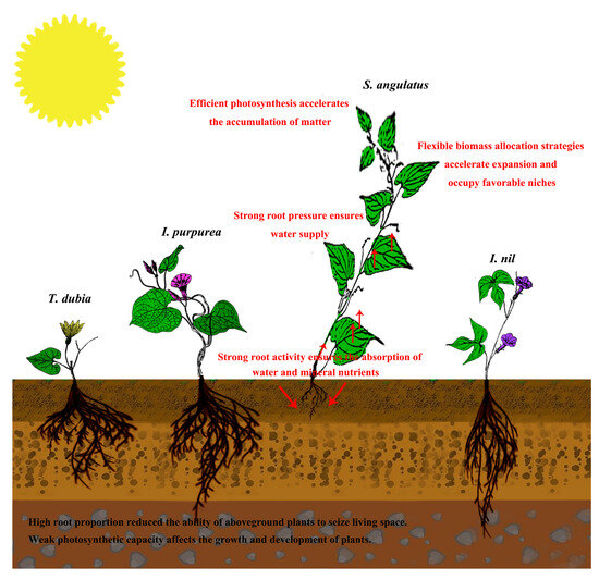 The growth and development characteristics of herbaceous vines and other herbaceous plants significantly differ. As described in the preface, vines rely on external support to grow vertically or horizontally to a certain height, and the latter requires a certain degree of lignification [25]. Therefore, a primary means for invasive vines to harm native plants is climbing and covering, promoting invasion by destroying the photosynthetic and nutrient absorption capacities of the latter [26]. Therefore, invasive vines tend to have specific biomass allocation characteristics that may help them occupy dominant niches in different habitats (Figure 5). In this study, the invasive plant Sa showed a rapid growth rate and a great biomass advantage during the fruiting period (Table 1). Generally, rapid growth rates and biomass are the basic advantages of invasive plants, which help them quickly occupy suitable niches, seize favorable environmental resources, and accumulate the living space of native plants, promoting the formers’ growth and population expansion [27]. For example, invasive plants such as Eupatorium adenophorum Spreng. [28], X. strumarium [29], and Ambrosia trifida L. [30] have larger biomass and faster relative growth rates than native plants in the areas that they invade.