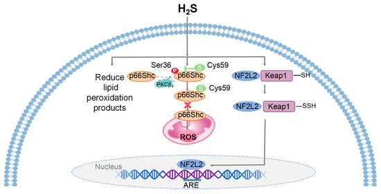A model illustrating the mechanisms of mitohormesis induced by H2S. Physiological levels of H2S provide cellular and tissue protection against oxidative stress by ROS, reducing the accumulation of lipid peroxidation products, and enhancing the production of intracellular antioxidants. H2S inhibits mitochondrial ROS generation through the sulfhydration of the Cys-59 residue of p66Shc and its translocation to mitochondria. Upon oxidative stress, H2S facilitates the dissociation of NF2L2 from Keap1 and its translocation from the cytoplasm to the nucleus, where it binds to ARE and initiates the transcription of downstream target genes.