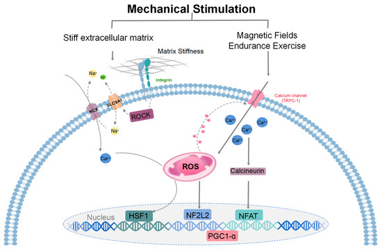 A model illustrating the mechanisms of mitohormesis induced by mechanical stimulation. Mechanosensing of a stiff extracellular matrix at adhesion sites activates ROCK to stimulate ion exchange by SLC9A1 and NCX. Subsequent mitochondrial calcium overload drives the production of ROS and stimulates the transcription of HSF1. HSF1-mediated mitochondrial stress suppresses the production of ROS by limiting mitochondrial respiration and opposes oxidant damage by promoting mitochondrial biogenesis/protein turnover and enhancing reducing equivalents (reduced glutathione/NADPH). Magnetic fields and endurance exercise signals are detected by transient receptor potential channels (TRPC), which regulate mitochondrial response and promote mitochondrial kinesis. During exercise training, metabolism increases sharply, repeatedly triggering the body’s compensatory physiological response, and ROS levels rise, which can be weakened by supplementation of antioxidants. These signaling pathways that activate ROS lead to gene expression that mediates the cellular adaptive responses. Key regulators of these processes include transcriptional coactivators, specifically PGC-1α. ROS regulate TRPC1, and TRPC1-mediated calcium entry participates in mechanical signaling by activating the calcineurin pathway to form various adaptive responses. Calmodulin-dependent calcineurin dephosphorylates and translocates NFAT to the nucleus. When ROS levels are elevated, NF2L2 binds to antioxidant reaction components in the nucleus and promotes the expression of cellular antioxidant and defense proteins.