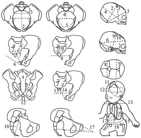 The feto-pelvic variables of the extant obstetrical and fossil samples. Pelvic variables: (1) maximal transverse diameter of the inlet; (2) inlet antero-posterior diameter, (3) inlet sacral breadth, (4) posterior inlet diameter, (5) pectineal angle (6) midplane angle, (7) midplane antero-posterior diameter, (8) interspinous diameter, (9) posterior midplane diameter, (10) midplane sacral breadth, (11) subpubic angle, (12) transverse outlet diameter, (13) posterior outlet diameter, (14) outlet antero-posterior diameter, (15) sacral chord length, (16) sacral chord subtense, (17) inlet–midplane angle (angle formed by the inlet plane and the midplane, measured in a strict sagittal view). Fetal variables: (1) submentobregmatic diameter, (2) suboccipitobregmatic diameter, (3) suboccipitofrontal diameter, (4) mentovertical diameter, (5) mento-occipital diameter, (6) occipitofrontal diameter, (7) biparietal diameter, (8) bitemporal diameter (9) right tragion–bregma diameter, (10) left tragion–bregma diameter, (11) suboccipitobregmatic circumference, (12) head circumference, (13) biacromial diameter, (14) sternum–thoracic vertebral diameter, (15) abdominal circumference, (16) abdominal sagittal diameter, (17) transverse abdominal diameter, (18) bitrochanterian diameter.