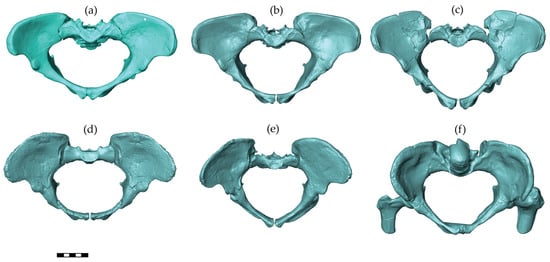 Australopithecines are early hominins that lived in South and East Africa between 4 and 2 million years ago [40]. The pelvic reconstructions of three australopithecine species were considered in this study, including Australopithecus afarensis, A. africanus, and A. sediba (Figure 2). Assuming the same pelvic sexual dimorphism in australopithecines and modern humans and based on associated dental morphology of these early hominins, reliable attribution of the sex is possible among these pelvises [41,42,43]. The A.L. 288-1 (Hadar, Ethiopia, 1974) pelvis belongs to a female A. afarensis dated to around 3.2 million years [44] with an individual age at death of close to the end of the third decade of modern humans [45]. For this pelvis, we included three different reconstructions in the analyses. The manual reconstruction of Haeusler and Schmid [46] was scanned with a high-resolution surface scanner (PT-M4c, Polymetric GmbH, Darmstadt, Germany). Lovejoy’s manual reconstruction [42] was generously provided by the author as a 3D surface scanner-generated model based on a cast. We scaled the 3D model of Lovejoy’s reconstruction by a factor of 1.046 sagittally and 1.033 mediolaterally as well as superoinferiorly to obtain the dimensions published by Tague and Lovejoy [10]. The virtual reconstruction of the A.L. 288-1 pelvis by Brassey et al. [47] was available as a 3D model from Figshare (https://doi.org/10.6084/m9.figshare.c.3462618 accessed on 12 February 2018). The Sts 14 pelvis (Sterkfontein, South Africa) is a presumed female A. africanus [48], with an age at death around 16 years compared with modern human standards [49], and it is dated to around 2.1–2.6 million years [50]. Two different reconstructions of Sts 14 were included as follows: the manual reconstruction by Haeusler and Schmid [46] was scanned with a PT-M4c, Polymetric GmbH, Darmstadt, Germany, whereas the virtual reconstruction by Berge and Goularas [9] was generously provided by one of the authors. The MH2 (Malapa, South Africa) pelvis is attributed to A. sediba [43] and dated to 2–1.8 million years [51]. The pelvis belongs to a female of advanced age (based on the heavily worn molars) [51]. For this pelvis, a cast of the reconstruction performed and provided by Schmid [43] was scanned with a PT-M4c high-resolution surface scanner.