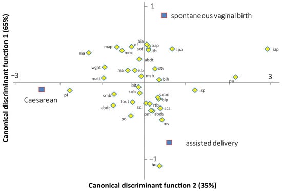 Table 2 presents the classification error of the canonical discriminant analysis. Of the 24 women with Caesarean delivery, 19 (79.2%) were well-predicted. Of the remaining 107 women (i.e., without Caesarean delivery), 76 (71.0%) were well-predicted. There was significant discrimination between Caesarean delivery and the other delivery outcomes (λ Wilks = 0.345; p < 0.001). Of the 51 women with spontaneous vaginal birth, 32 (62.7%) were well-predicted, and of the 56 women with instrument-assisted delivery, 44 (78.6%) were well-predicted. The discrimination between vaginal birth and instrument-assisted delivery was not significant (λ Wilks = 0.659; p = 0.124).