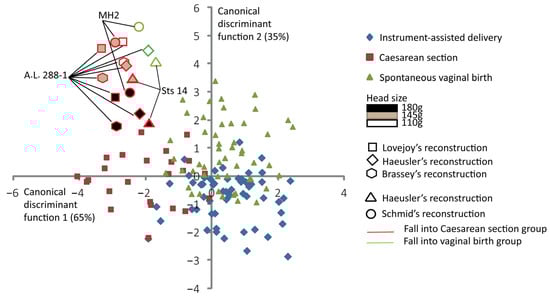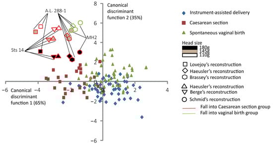 Figure 5 shows the supplementary canonical discriminant analysis with the reconstruction of Sts 14 of Berge and Goularas [9], which is predicted to fall into the “Caesarean section” group with all brain sizes considered. In this analysis, the A.L. 288-1 reconstruction of Lovejoy [10] and the Sts 14 reconstruction of Haeusler and Schmid [46] are all predicted to fall in the “Caesarean delivery” group. The MH2 reconstruction of Schmid [43] is predicted to fall into the “Caesarean delivery” group for a brain size of 180 g. For this supplementary analysis, the overall prediction error is 68.7%.