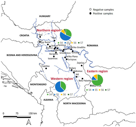 Distribution of golden jackal samples across Serbia’s regions. The country is delineated into three regions—northern, eastern, and western—by the Sava, Danube, Great Morava, and South Morava rivers. The pie charts show the distribution of sequence types S4–S7 in the northern (top), western (left), and eastern (right) parts of Serbia.