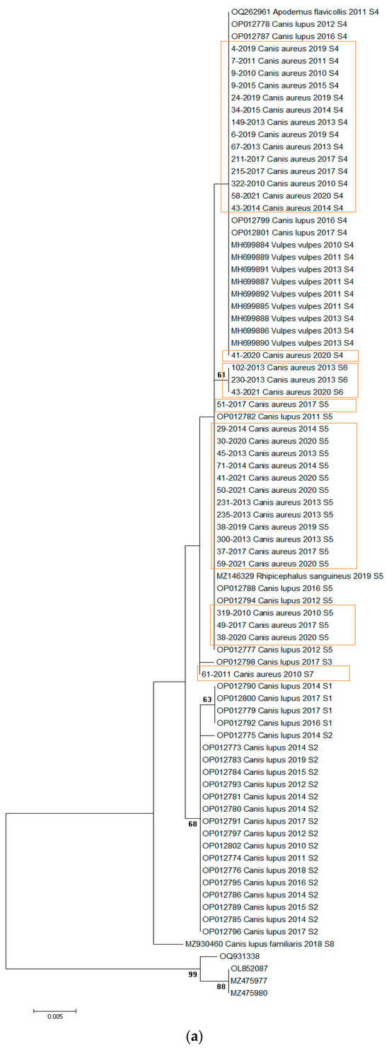 The mean nucleotide distance of all sequences included in the study was 0.34% (range from 0 to 0.107%), while the nucleotide distance among H. canis sequences isolated from jackals was 0.12% (range from 0 to 0.34%) and from wolves was 0.32% (range from 0 to 0.86%). Maximum likelihood and Bayesian inference phylogenetic analyses of all sequences included in the study gave mostly congruent results (Figure 2a,b). Phylogenetic analysis revealed three large clusters (Figure 2a). The first clade (29/77, 37.66%) was heterogeneous, including sequences from grey wolves, red foxes, and jackals, and one from A. flavicollis, all S4. The second cluster (24/77, 31.17%) was diverse, containing sequences from grey wolves, jackals, and one R. sanguineus tick, predominantly S5, with three jackal sequences classified as S6. The third clade (21/77, 27.27%) was monophyletic, consisting of grey wolf sequences, mostly S2, with three S1. Three sequences did not fit into these clusters and were classified as S3, S7, and S8. Of note, the only exception between two phylogenetic trees was observed in the position of one sequence originating from a wolf (acc. no. OP012798). In a maximum-likelihood phylogenetic tree, this sequence was identified as the S3 sequence type, while in a Bayesian tree, it was classified into the S4 sequence type.