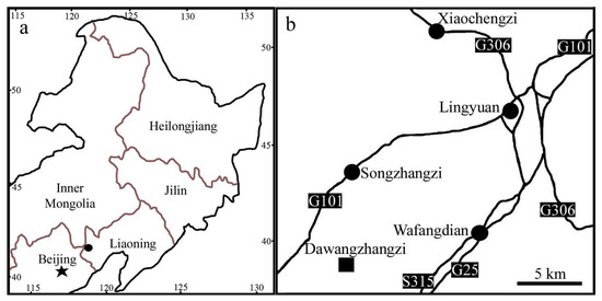 The fossil locality of Archaebuda cretaceae, Dawangzhangzi, Lingyuan, Liaoning, China. Modified from Han et al. [51], with permission and courtesy of Acta Geologica Sinica (English edition). (a) Fossil locality (black dot) in northeastern China. (b) Detailed position of fossil locality (square) in the suburb of the City of Lingyuan, Liaoning, China.