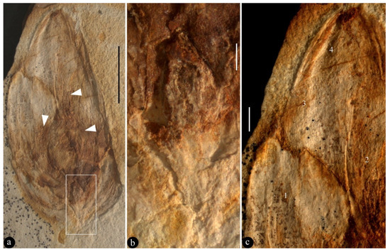 The holotype of Archaebuda cretaceae and its details. (a) The general view of the specimen. The possible androecium is marked with white triangles. Scale bar = 5 mm. (b) A detailed view of the rectangle is shown in Figure 2a, showing the gynoecium. Scale bar = 0.5 mm. (c) A detailed view of the tip portion of the bud shown in Figure 2a, showing different textures on and borders between different petals (1–4). Scale bar = 1 mm.