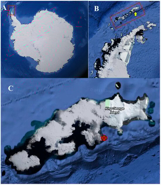 Satellite images of the study region from which the rock samples analysed were obtained (https://www.google.com.br/maps/, accessed on 28 February 2024). (A) Antarctica, with the Antarctic Peninsula indicated within the red rectangle, (B) South Shetland Islands indicated within red rectangle and King George Island indicated by yellow arrow, (C) King George Island with the Lions Rump region highlighted by the red circle. Images obtained from Google Earth Pro, 2019 (https://earth.google.com, accessed on 28 February 2024).