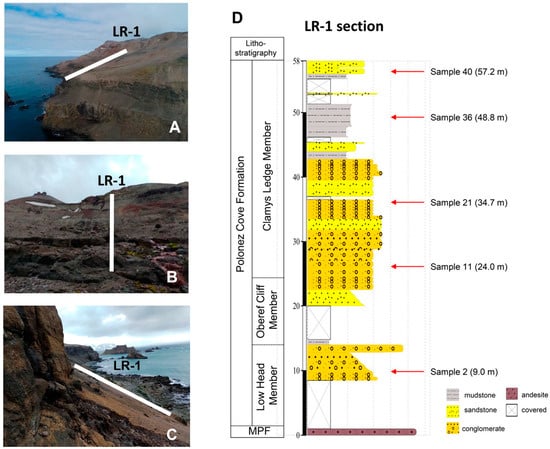 Lithostratigraphic scheme of the Mazurek Point Formation at Lions Rump, King George Island. (A–C): sections where the samples were obtained. Photographs of the limits (base and top), where the samples were collected. (D): Geological interpretation of the Formation; MPF = Mazurek Point Formation. Images by Gustavo Santiago. Samples 9.0 m (sample 2), 24.0 m (sample 11), 34.7 m (sample 21), 48.8 m (sample 36) and 57.2 m (sample 40).